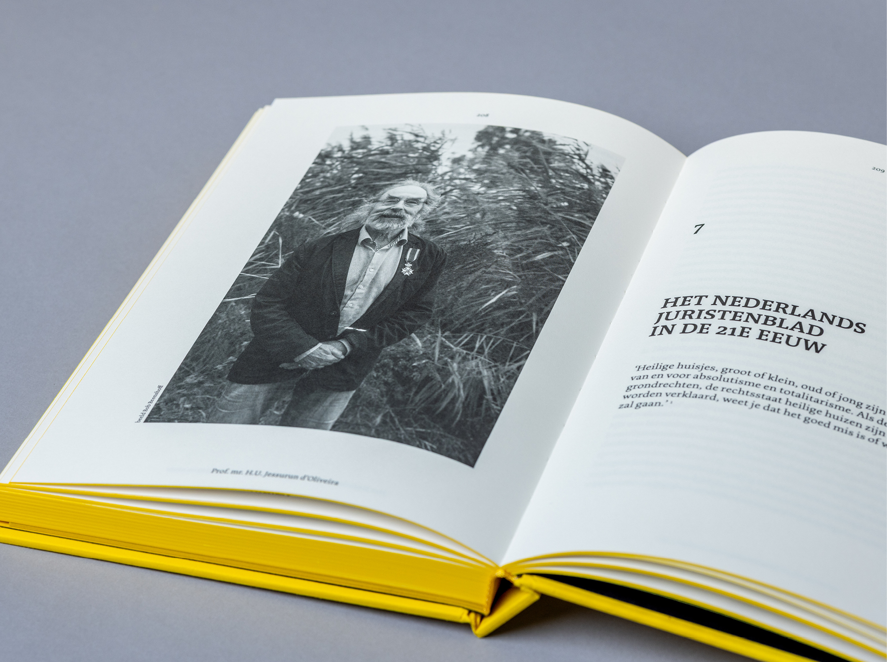 Het eerste nummer van het Nederlands Juristenblad (NJB) verscheen op 20 november 1925. Een eeuw later is het tijd om te reflecteren met een inhoudelijk boek, met een schets van de geschiedenis van het NJB over de afgelopen honderd jaar in al zijn grandeur en misère. Dé kleur van het NJB was aanleiding om een minimalistisch statement te ontwerpen. In warmgeel!Tot de kleur op snee aan toe. Het jubileumkarakter werd gevonden in het intergraal opnemen van het eerste gedrukte nummer en de bijzondere cassette om het boek. Het Nederlands Juristenblad 1925-2025. Over de polsslag van de tijd.